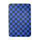 A blue and black checkerboard pattern fills the image, creating a uniform, alternating grid of squares, conveying a bold and geometric feel.