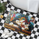 O gato Calico brincando com um dragão chinês vermelho em frente a uma janela de vidro colorido de pavão.
