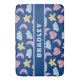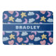 O tapete de banho deste menino giro para um banho de creche de bebês ou banheiro para crianças apresenta um fundo azul escuro com corações, estrelas e luas em um tema de ninar. Perfeito para um chá de fraldas ou aniversário de criança e personalize com um nome para um toque exclusivo.