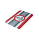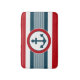 Design náutico com decoração em forma redonda com âncora sobre fundo listrado a azul, vermelho e branco