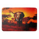 Um elefante de touro pisa da escova, banhada no escarlate do por do sol.