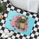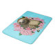 Uma preguiça bonita entre flores cor-de-rosa contra um pano de fundo azul.