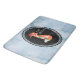Um banho que combina com uma ilustração fofa cor de laranja, dentro a oval preta. Ele está vestindo um chapéu de anã vermelho e tem sotaques decorativos verdes festivos na cauda e no peito. Feliz Natal também está escrito dentro do quadro oval. O plano de fundo é uma cor de cinza azul vintage com aparência semelhante, com um padrão de ponto desbotado ao longo da parte superior e inferior.