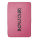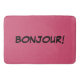 A palavra francesa, BONJOUR escrito no preto com um fundo cor-de-rosa.