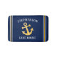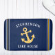 Um tapete de banho náutico, perfeito para sua casa no lago! Com fundo azul-marinho, há listras brancas e amarelas em ambos os lados e, no meio, uma âncora de padrão chevron amarela e branca. Acima, na tipografia branca moderna você pode personalizar com seu nome familiar e, por baixo, a tipografia branca lê "Lake House".