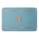 Um tapete de banho monograma de luxo, de aparência exclusiva, com um tapete de banho de cobre, de ouro fino, revestido de uma quadrícula metálica de cobre e listras sobre um fundo azul na moda. Personalize-o com o nome e o monograma inicial. Pode ser um presente pessoal ou familiar elegante e personalizado para um aniversário, aquecimento doméstico, aposentadoria, feriado, aniversário ou qualquer outra ocasião.