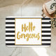 Linda e moderna citação de pincel da tipografia moderna. "Olá, linda". Apresentando um bonito quadro luminoso metálico dourado e letras douradas com listras pretas e brancas.