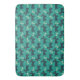 Um tapete de banho desenhado com um padrão repetitivo que apresenta um cão sorridente e bonito, com orelhas de disquete e um osso de cão. Fundo verde.