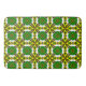 O design geométrico vibrante apresenta formas coloridas ousadas com motivos florais simétricos, oferecendo um toque vivo e artístico.