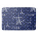 A Torre Eiffel, as palavras "Joyeux Noël" (Feliz Natal em Francês), Paris em tipografia de vintage e vintage as etiquetas francesas para champanhe e cacau de cor branca num fundo azul profundo com flocos de neve de cor azul clara fazem um adorável e interessante tapete de banho francês. Itens correspondentes estão disponíveis na minha loja Zazzle.
