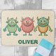 Este adorável tapete personalizado apresenta três monstros bonitos e felizes se divertindo juntos.