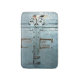 Porta metálica de cinza turquesa com fechaduras, rodas, texto e fita-cola. Fotografado num antigo edifício no País de Gales, editado. Por Alexandra Cook aka Linandara.