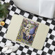 Fada-de-fada loira vestida roxa e vermelha num padrão geométrico floral em verde, laranja, lavanda e rosa.