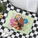 Um panda vermelho giro segurando a cauda. Flores lótus e hena num pano de fundo verde estão em volta do panda vermelho. Tudo desenhado num estilo de tatuagem.