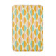 Repeating geometric pattern with overlapping leaf shapes in orange, teal, and pink on a beige background. The design conveys a retro, vibrant feel.