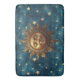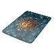 Em meio a um fundo celestial estrelado, o rosto sereno de um sol dourado estilizado.
