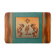 Ele apresenta um dois Kokopelli sudoeste tocando flauta e dançando em volta de um cacto sob o sol em um fundo de turquesa... cercado por uma borda de cobre!