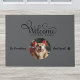 Este tapete personalizado com foto de cachorro é o presente perfeito para qualquer amante de cães. Este design inclui as palavras "Bem-vindo à nossa casa", um espaço para adicionar seu nome e o nome do seu cachorro, e um espaço para adicionar sua própria foto. Aproveite!
