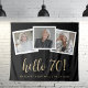 Esta tapeçaria personalizada de aniversário de 70 apresenta uma colagem de três fotos quadradas personalizadas acima da frase "alô 70!" em um elegante roteiro de caligrafia dourada e sans serif font em um fundo preto. Adicione o nome do convidado de honra e o aniversário abaixo. Uma forma excelente de celebrar alguém que faz setenta anos!