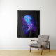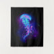 Água-viva grande, azul, desenhada artisticamente, brilhante, brilhante, com longos tentáculos sobre fundo preto com bioluminescência roxa. Água-viva luminosa.