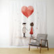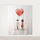 Uma ilustração minimalista e emocionante de um casal de mãos dadas, conectado por um balão vermelho em forma de coração que flutua sobre elas. A simples design, textura aquosa, e maleáveis manchas de cor em um fundo branco dão uma sensação suave e sonhadora ao trabalho de arte, simbolizando amor e união de uma forma pura e inocente.