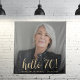 Esta tapeçaria personalizada de aniversário de 70 apresenta a foto personalizada, o nome e o aniversário do convidado de honra, juntamente com a frase "olá 70!" em um elegante roteiro de caligrafia dourado. Uma tela escura ajuda a tornar o texto pop. Uma forma excelente de celebrar alguém que faz setenta anos!