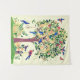 Tapeçaria em uma árvore enfeitada com delicadas flores cor-de-rosa e repleta de pássaros vívidos em meio a folhagem exuberante. A cena inclui adornos divertidos e elementos surreais, criando uma atmosfera de sonho, de livro de histórias.
