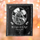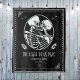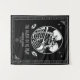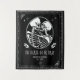 Até que a morte nos separe cenário de casamento ou recepção com um casal de esqueletos, nomes personalizados e data estabelecida. Design em preto e branco com estilo gótico.