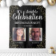 Tapeçaria elegante de festa de aniversário conjunta apresentando um fundo preto estiloso que pode ser alterado para qualquer cor, 2 fotos, uma chuva de confetes dourados brilhantes, e um modelo moderno de dupla celebração que é fácil de personalizar.
