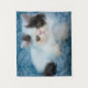 Esta fotografia Getty Images bonita apresenta um gatinho branco e preto esmaecido sentado em cobertor azul.