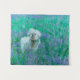 Tapeçaria com trabalho de arte de mão desenhada de um frise de bichon em um campo de bluebonnets. Trabalho de arte: lápis colorido. Copyright: Dominic A. White. Todos os direitos reservados.