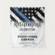 Este design apresenta uma bandeira da polícia com listras pretas e brancas, e uma fina faixa azul de linha também. "Celebração de aposentadoria" fica acima de todos os detalhes partidários para a polícia aposentada, xerife, capitão ou comemoração de aposentadoria do chefe.
