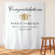 Elegante tapeçaria de boas-vindas à festa de formatura branca e pano de fundo fotográfico com boné de formando de ouro, "Parabéns" em um roteiro clássico de caligrafia e o nome do formando, escola e ano de aula em letras modernas.