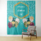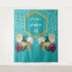 Um polígono elegante com brilho dourado para o seu texto em um fundo azul-turquesa com brilho azul-turquesa brilhante caindo e balões de festa com brilho dourado.
