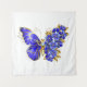 Borboleta de flores cinza, azul, safira, espumante com asa decorada com flores preciosos azuis com folhas de ouro sobre fundo branco.