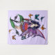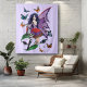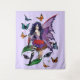 Fada de cabelos negros e bonitos em roxo e vermelho sentado sobre um cogumelo num pano de fundo roxo