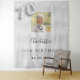 Uma tapeçaria de boas-vindas para uma festa de 70 anos glamourosa. Um fundo metálico prateado falso decorado com pó de brilho falso. Personalize e adicione uma foto de alta qualidade, nome e data. O número 70 é escrito com uma fonte estilo balão.