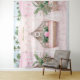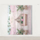Este fundo de foto apresenta uma fileira de cabanas de piscina listradas de rosa e branco com plantas tropicais e almofadas de folhas tropicais combinando. A cabana central pode ser personalizada com um nome. Perfeito para um fotobooth de festa de piscina.