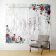 Crie a recepção de casamento perfeita com este design moderno e moderno de tapeçaria de casamento embelezado com florais poeirentos azuis e de cor d'água entrelaçados com verde de eucalipto, sobre uma textura de mármore branco sujo e tipografia de script escrita à mão. Os nomes dos casais e alguns detalhes do casamento estão em uma cor de burgundy equivalente. Convidados Elegantes de Direitos Autorais. Todos os direitos reservados.