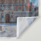 Praça da prefeitura durante o ensolarado dia de neve de inverno em Riga, Letónia. Vista coberta na Casa de Neve dos Chanteiros e Estátua de Roland em Old Riga