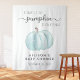 Um bonitinho chá de tapeçaria bem-vindo, sinal de boas-vindas e protetor fotográfico com uma aquarela azul pastel e "A Sweet Little Pumpkin Is On Your Way" escrito em uma mistura de tipografia de cinza e um roteiro de na moda com pestanas. Personalize com o nome da futura mãe e a data do chá.