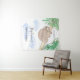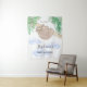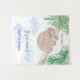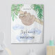 Esta tapeçaria de Chá de Bebê é decorada com uma aquarela de um bebê sloth sorridente pendurado em um galho, emoldurado com folhas da selva e nuvens azuis.