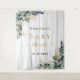 Um fundo de madeira branca rústica. Decorado com folhas de eucalipto coloridas em verde à aguarela, raminhos, folhagens e folhas de ouro falso. Personalize e adicione o nome da futura mamãe e uma data. Letras pretas e douradas. Pode ser usado como um banner de boas-vindas para chá de bebê, como decoração de parede para festa ou como fundo para cabine de fotos.