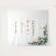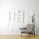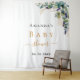 Um fundo branco chic. Decorado com folhas de eucalipto pintadas à mão em verde, raminhos, folhagens e folhas de ouro falso. Personalize e adicione o nome da futura mamãe e uma data. Letras pretas e douradas. Pode ser usado como um banner de boas-vindas para chá de bebê, como decoração de parede para festa ou como fundo para cabine de fotos.