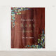 Madeira marrom rústica como fundo. Decorado com folhas de eucalipto pintadas em verde-água, raminhos, folhagens e folhas de ouro falso. Personalize e adicione o nome da futura mamãe e uma data. Letras brancas e verdes. Pode ser usado como banner de boas-vindas para chá de bebê, como decoração de parede para festa ou como fundo para cabine de fotos.
