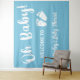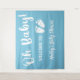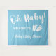 Uma tapeçaria de boas-vindas para chá de bebê menino com "Oh Bebê!" em um estilo de letra cursiva branca, uma ilustração de pés de bebê branca, e o nome da futura mãe em letra cursiva branca, tudo contra um fundo azul pastel.