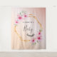 Tema de verão e tropical. Balões femininos e modernos para um Baby Shower. Um fundo gradiente rosa claro feminino, rosa dourado, rosa bege decorado com moldura geométrica em dourado falso e flores tropicais rosa, Hibiscus. Modelos para um nome. O texto: Bebê é escrito com um estilo de letra manuscrita moderna. Perfeito como decoração de parede de festa, sinal de boas-vindas ou como fundo de foto, fundo de photobooth. Neutro em termos de gênero ou celebrando uma menina.