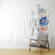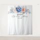 Pano de fundo para fotos de chá de noiva com rosas cor-de-rosa e azul-marinho, com um buquê elegante de rosas azuis, brancas, cor-de-rosa e folhas de eucalipto verde-sage. Por favor, entre em contato para ajuda na personalização ou se precisar de outro produto com este design.