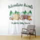 Uma lindíssima tapeçaria rustica de chá de fraldas, sinal de boas-vindas e pano de fundo fotográfico com uma bela ilustração de animais da floresta com sua tenda acampando nas montanhas e na floresta e "Aventura Aguarda" e o nome da futura mãe em um roteiro verde da floresta.
