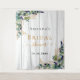 Chic rústico com madeira branca como fundo. Decorado com folhas de eucalipto pintadas em aquarela verde, raminhos, folhagens e folhas de ouro falso. Personalize e adicione o nome da noiva e uma data. Letras pretas e douradas. Pode ser usado como banner de boas-vindas de chá de panela, como decoração de parede de festa ou como fundo de cabine de fotos.